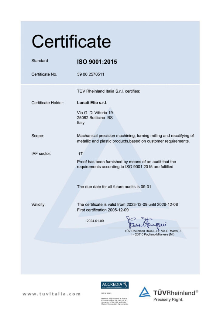 For us at Lonati Elio Srl, this certification has been an unquestionable choice since 2005, the year in which we decided to undertake the checks and audits required to obtain the certification. Since then, ISO 9001 has been and continued being a fixed point for us and our customers, proof of the attention to detail and high product quality that we want to maintain in every single phase of our third-party machining operations.