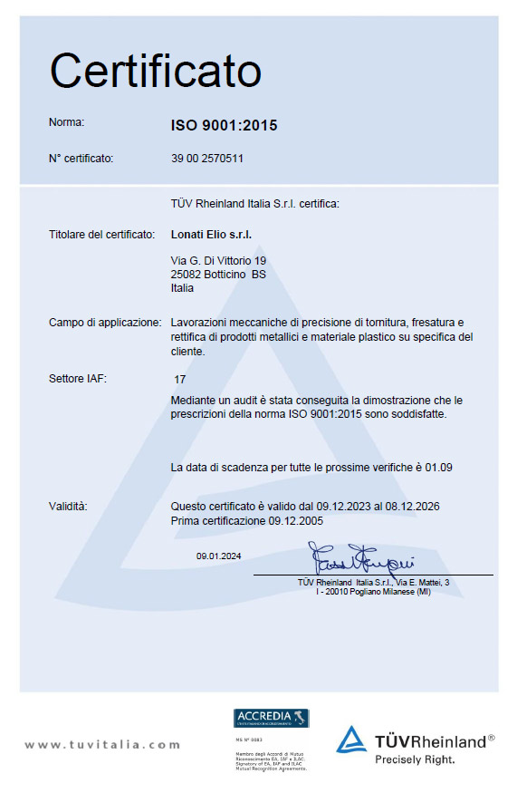 La certificazione per il sistema di gestione (management system) della qualità UNI EN ISO 9001:2015, più semplicemente nota come ISO 9001, rappresenta un traguardo importante per le aziende che vogliono dimostrare in maniera oggettiva la bontà e accuratezza degli standard adottati per svolgere lavori e servizi nel proprio ambito. Questa certificazione, per la Lonati Elio Srl, è diventata una scelta insindacabile a partire dall’anno 2005, anno in cui abbiamo deciso di affrontare le verifiche e gli audit valevoli all’ottenimento della certificazione stessa. Da allora, la ISO 9001 è stata e continua ad essere per noi e per i nostri clienti un punto fermo, la prova della cura per i dettagli e per l’alta qualità del prodotto che vogliamo mantenere in ogni singola fase delle nostre lavorazioni in conto terzi.
